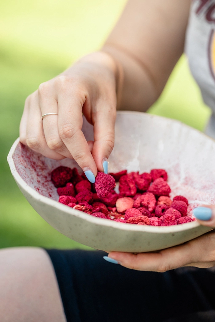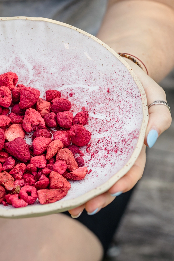 Paletas de tarta de queso con frambuesas liofilizadas