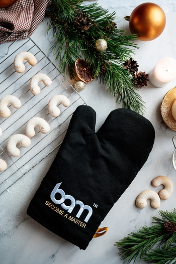 Con su moderno diseño y su elegante color negro neutro, el guante de repostería BAM se ha convertido en el mejor amigo de un pastelero. Protege sus manos de las bandejas de horno calientes con galletas frescas. Y gracias a su material antideslizante, evitará que las ollas calientes y las bandejas de horno resbalen de sus manos. El guante de repostería BAM no es apto para el lavado a máquina ni el secado en secadora. El tamaño del guante es de 29 cm x 17 cm.