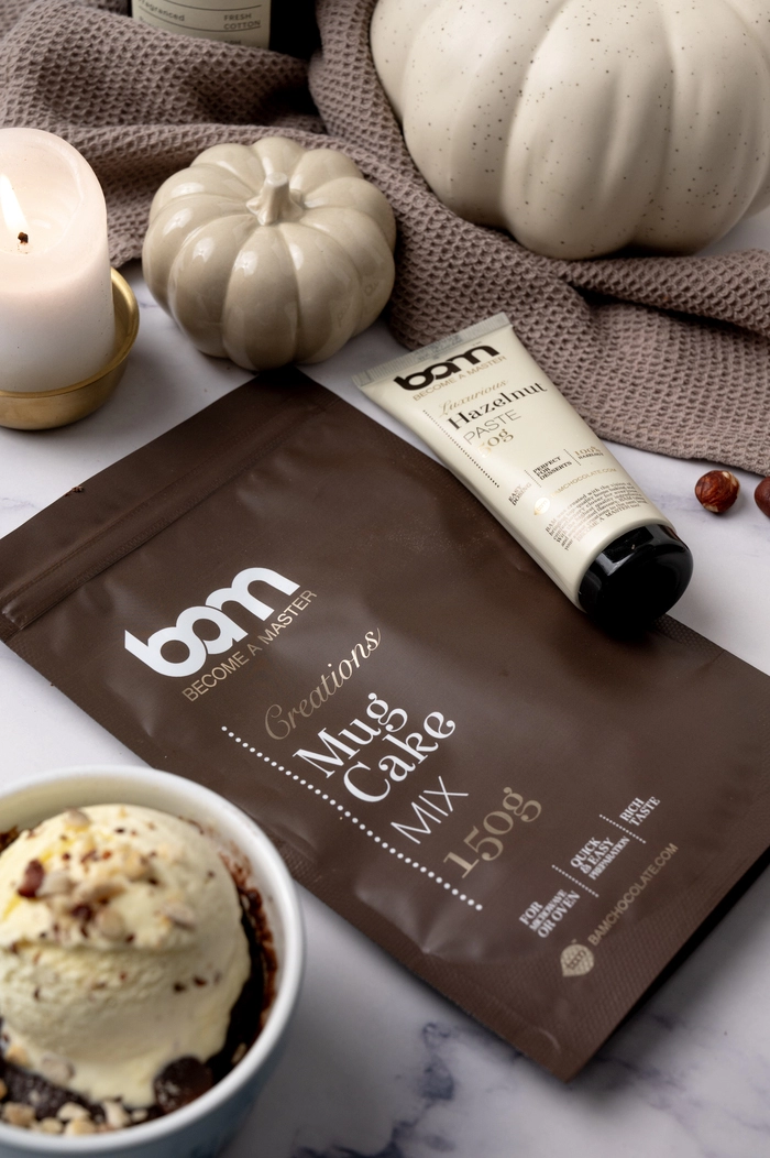 Consejo sobre el chocolate: Enriquecer la mezcla con Pasta de Vainilla BAM. Decore el Mug Cake ya horneado con fruta fresca, toppings BAM, cremas para untar BAM y una bola de helado BAM.