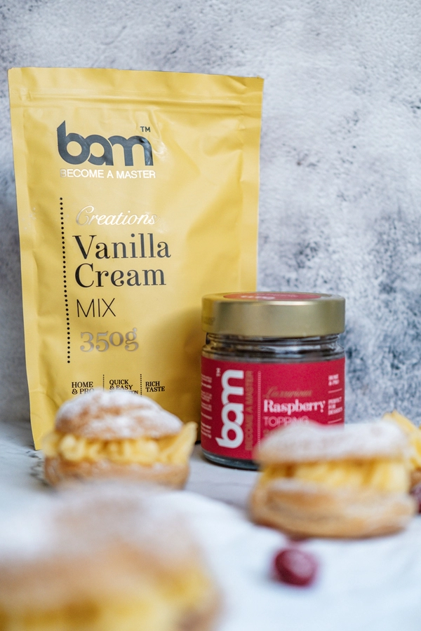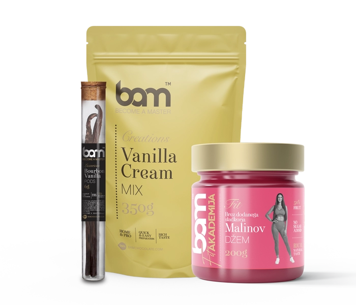 Hemos creado un paquete de productos con los que se puede preparar un delicioso y sabroso pastel de vainilla con frambuesas. La mezcla de crema de vainilla BAM, las vainas de vainilla BAM y la cobertura de frambuesa BAM crean una combinación de sabores con la que realmente no te puedes equivocar. ¡Conviértase en pastelero con nosotros!
