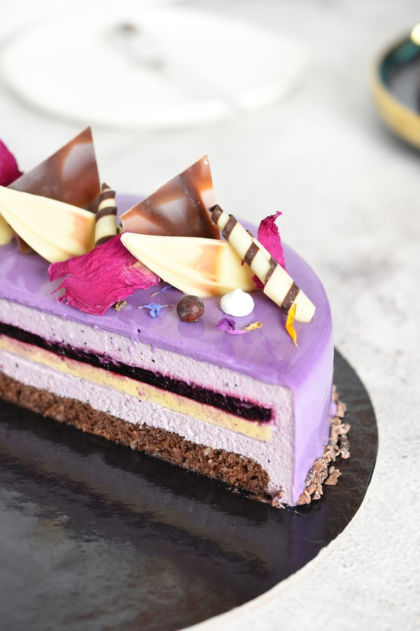 Cuando la tarta esté completamente congelada, caliente los glaseados a unos 30-32 °C, remuévalos con una batidora de varillas y cuélelos. Vierta el glaseado blanco en el glaseado morado y remueva con movimientos circulares poco profundos.